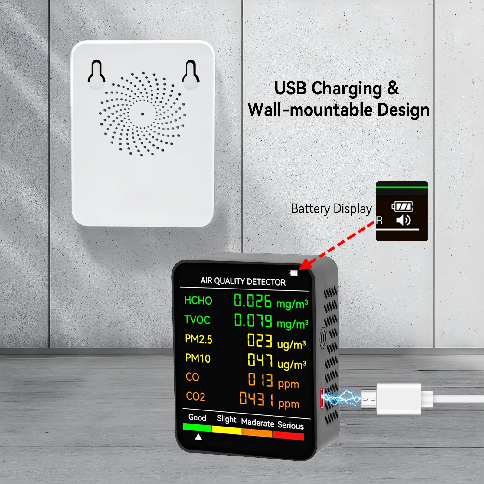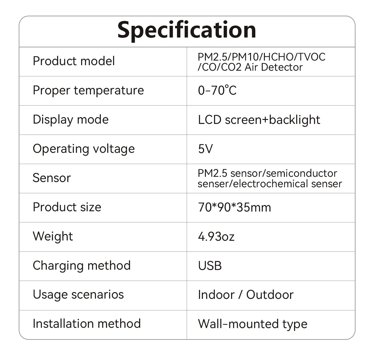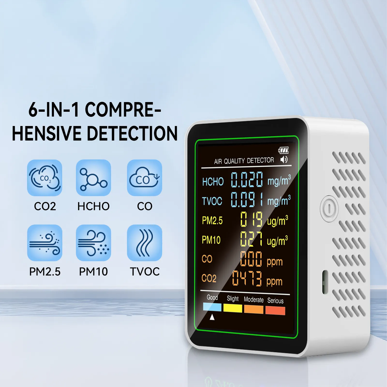 - Comprehensive Detection: Detects formaldehyde, PM2.5, CO, CO2, and more.